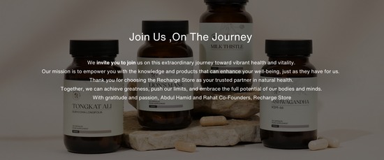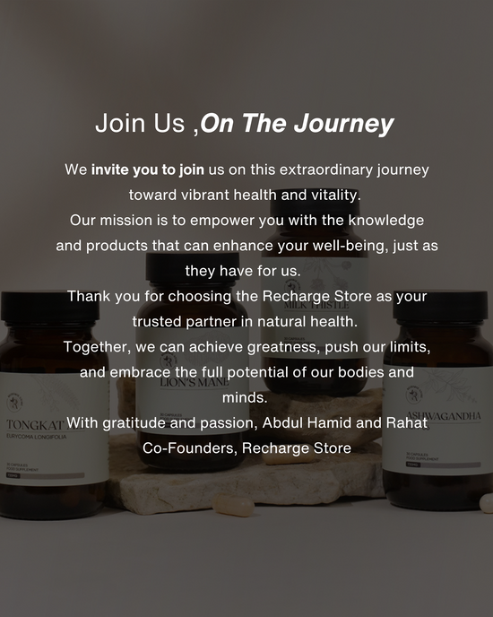 Welcome to The Recharge Store, where health and well-being are at the core of everything we do. We are more than just a supplement provider we are a passion-driven brand founded by two brothers dedicated to promoting vitality, longevity, and a healthier lifestyle through high-quality, science-backed wellness products.